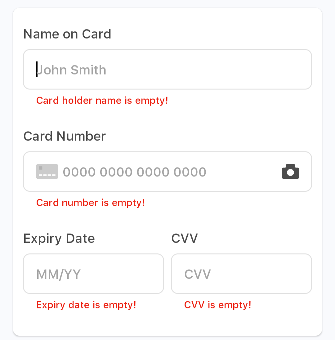 Bank card form validation: So for example, if you set a none valid card number or empty input you will face an validation error message.
